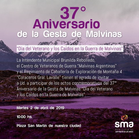 La intendente municipal Brunilda Rebolledo, el Centro de Veteranos de Guerra "Malvinas Argentinas" y el Regimiento de Caballería de Exploración de Montaña 4 "Coraceros Gral. Lavalle" tienen el agrado de invitar a Ud. a participar de los actos conmemorativos del 37° Aniversario de la Gesta de Malvinas "Día del Veterano y los Caídos en la Guerra de Malvinas".
