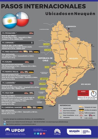Cabe aclarar que los otros pasos habilitados en Neuquén - Pichachén, Copahue y Carirriñe- abrirán de 8 a 19 hs hasta el 30 de abril (siempre y cuando el clima así lo permita).