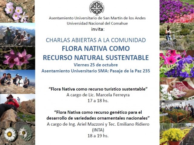 El Asentamiento Universitario SMandes (AUSMA) invita a profesionales, guías de turismo, guías de montaña, informantes, docentes y público interesado en la temática, a participar de la charla propuesta, donde disertara la Lic. Marcela Ferreyra ex profesora de botánica de la Universidad de Rio Negro y guía botánica, y de INTA Bariloche, el Tec. Emiliano Ridiero y el Ing. en recursos naturales renovables Ariel Mazzoni especialista en floricultura.
