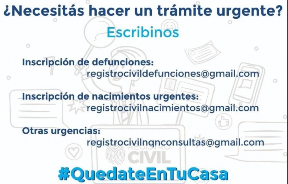 Otras urgencias: registrocivilnqnconsultas@gmail.com