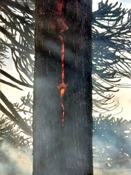 En tanto, se precisó que la tormenta eléctrica del jueves pasado fue la causa del origen del fuego. “Un rayo cayó sobre una araucaria y por lo general demora 72 horas o más en encenderse. No hay dudas que el fuego se inició como consecuencia de una tormenta eléctrica”, explicó Álamo.