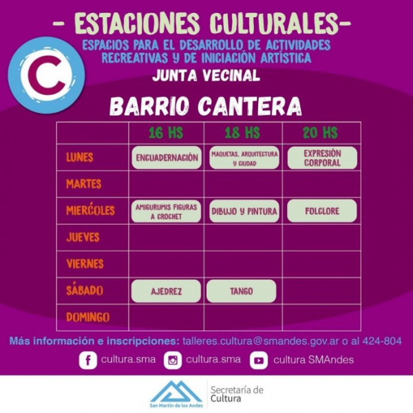 Las consultas e inscripciones deberán realizarse a través de talleres.cultura@smandes.gov.ar o por WhatsApp al 2944212937.