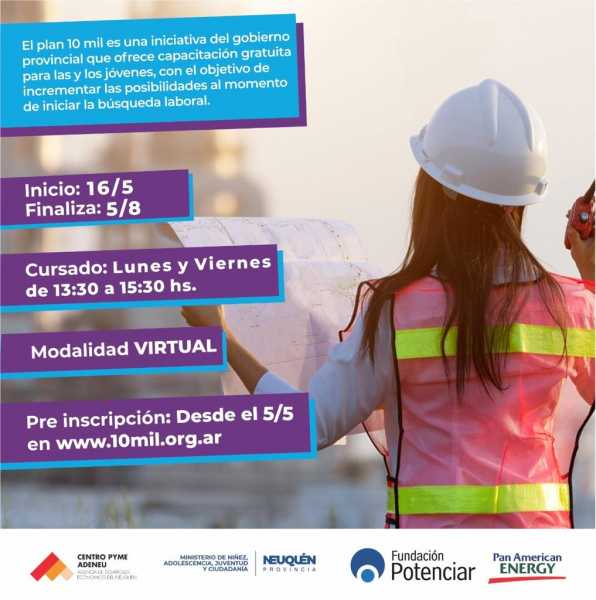 Cada curso está orientado a hombres y mujeres de 18 a 35 años con secundario completo o mediado y domicilio en la provincia del Neuquén. Los interesados e interesadas en inscribirse podrán hacerlo a través de www.10mil.org.ar