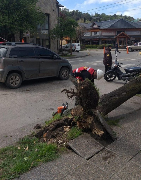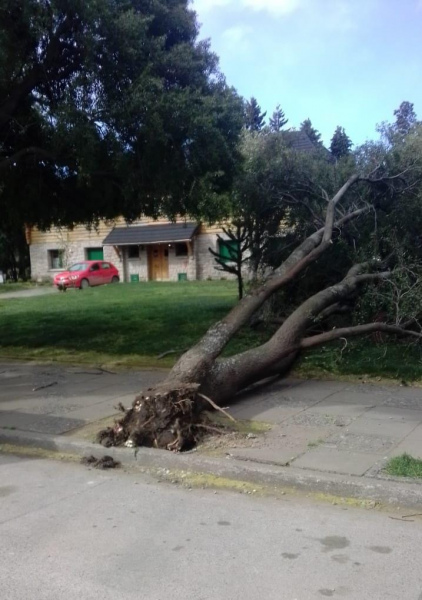 Más tarde, a las 16.50 horas, se produjo la caída de un árbol sobre Mariano Moreno, detrás de la vieja intendencia del Parque Nacional Lanín, donde Protección Civil asistió para despejar la vía pública.