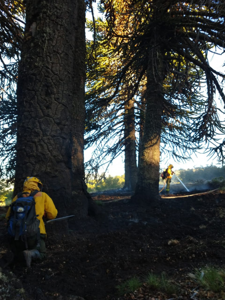 Trabajan en el lugar Brigadista de zona norte del PN Lanín, Recorredores del Proyecto Pewen, Brigadistas de Manejo del Fuego de Neuquén y Bomberos Voluntarios de Aluminé.