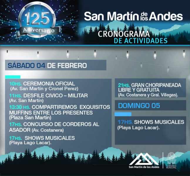 La Dirección de Protocolo Municipal comparte el cronograma de actividades que se realizarán en San Martín de los Andes, en el marco del 125° Aniversario de nuestra ciudad, que tendrá lugar el próximo sábado 4 de febrero.