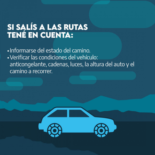 - Verificar las condiciones del vehículo: anticongelante, cadenas, luces, la altura del auto y el camino a recorrer.