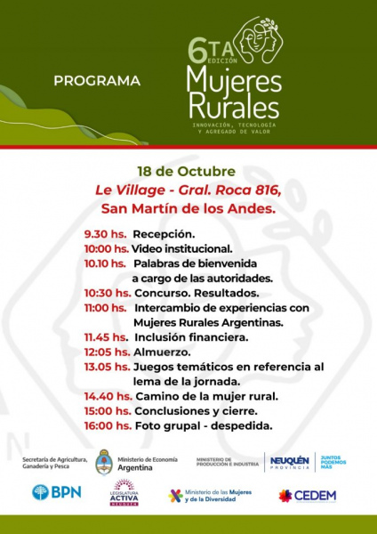 Se trata dela sexta edición del encuentro que pone en valor la existencia de mujeres que forjan el alimento y las tareas de campo, y ocupan cada vez más espacios de decisión en organizaciones y comunidades. Este año el lema será «Tecnología, innovación y agregado de valor», y cuenta con el apoyo de la Legislatura provincial, el Banco Provincia del Neuquén y la Secretaría de Agricultura y Pesca de la Nación, entre otros.