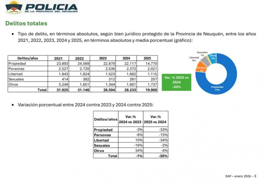 La provincia de Neuquén consolida una tendencia positiva en materia de seguridad. Según el Informe Estadístico Delictual 2025 elaborado por la Policía provincial, la cantidad total de delitos cayó un 30% respecto al año anterior, confirmando dos años consecutivos de descenso durante la gestión del gobernador Rolando Figueroa.