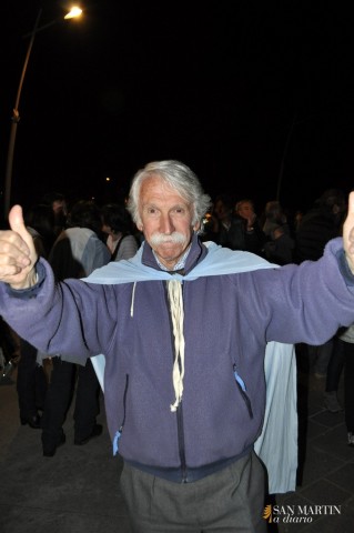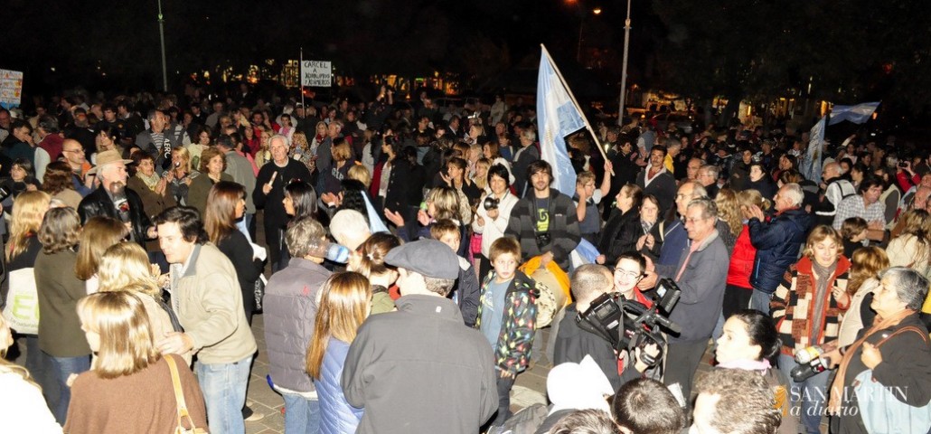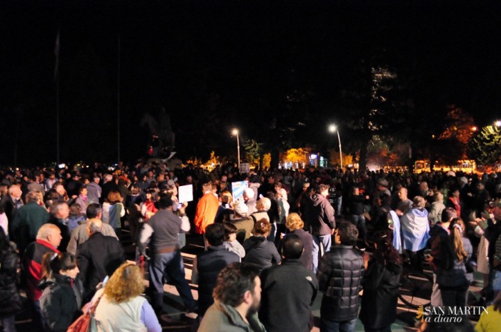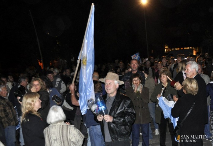 Un himno nacional cantado con fuerza, seguramente producto de una mezcla de sentido de patria y bronca al mismo tiempo, hizo que la plaza San Martín se quede por un momento sin el ruido que la venía acompañando desde las 20. Es que los casi 800 vecinos que se concentraron en el centro de una plaza, que estaba iluminada por la mitad, dejaron de golpear sus ollas, plásticos y cartones; para entonar las estrofas de la canción patria.
