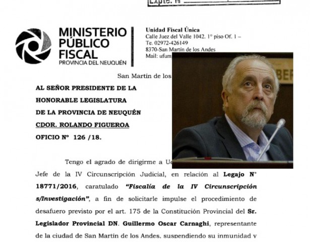 La solicitud fue elevada por el Ministerio Público Fiscal neuquino, detallando que el Legislador está acusado de los delitos de “ejercicio de funciones correspondientes a otro cargo” y “abuso de autoridad”, en el marco de una denuncia iniciada en 2016 por el Municipio local a funcionarios de la gestión anterior, respecto a la presunta inconstitucionalidad de la CIAP.