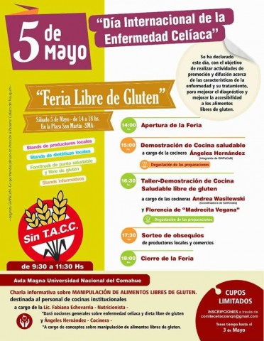 Se realizarán hoy, sábado, de 14 a 18 horas en el Salón Municipal. Habrá una Feria libre de Gluten, una demostración de cocina saludable, talleres y sorteos.