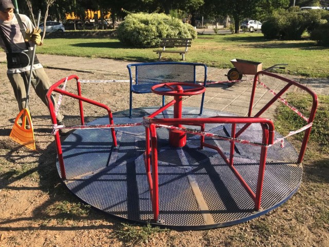 Los trabajos incluyeron a los juegos de la Plaza de Chacra 28, Rucahué y el casco céntrico. Hoy, además, se culminarán las tareas en la Plaza Centenario.
