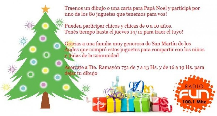 Gracias a la iniciativa de una familia solidaria de nuestra ciudad, Radio Fun sorteará 80 regalos entre los chicos y chicas de entre 0 y 10 años que acerquen su dibujo o carta para Papá Noel hasta este jueves.