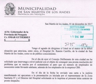 A pedido del Deliberante, luego de un requerimiento de vecinos autoconvocados y trabajadores del Ramón Carrillo, Rebolledo envió el viernes una carta al Gobernador Provincial, solicitando “pronto despacho” a la problemática que aqueja a los hospitales neuquinos, inmersos hace más de un mes en una medida de fuerza gremial.