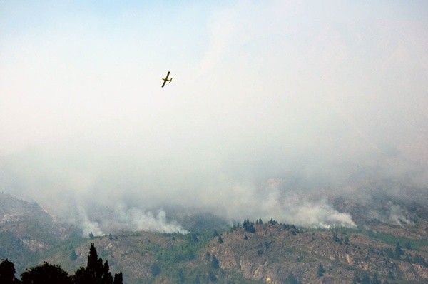 Desde las 16.30 de ayer, tres dotaciones de Bomberos Voluntarios de la localidad, personal de Incendios, Comunicaciones y Emergencias del Parque Nacional Lanín (ICE) trabajaron a destajo para sofocar un incendio de granes proporciones en los pinares de Cordones del Chapelco. (Click en la foto para ver galería de imágenes)