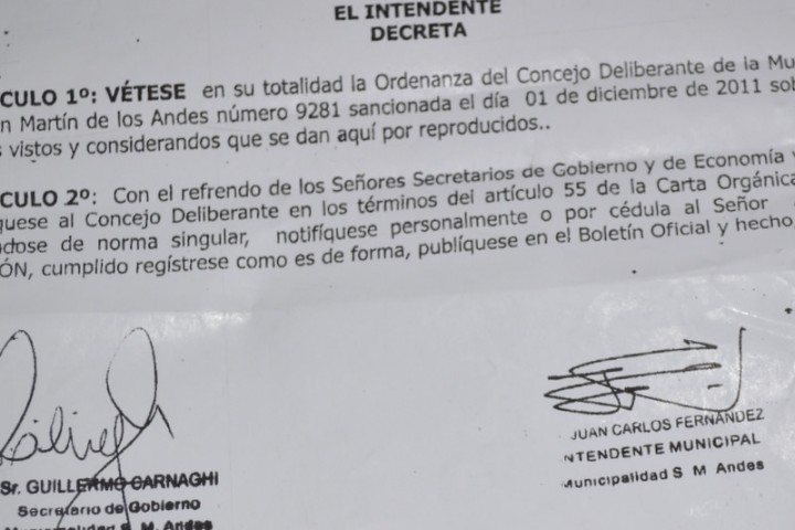 Esta vez fue el Intendente Juan Carlos Fernández. El 20 de diciembre vetó la ordenanza particular que habilitaba al vecino Alejandro Cordón a explotar comercialmente su emprendimiento “La Ranchera” en un predio autorizado por el Intendente del Parque Lanín – ahora Secretario de Turismo.