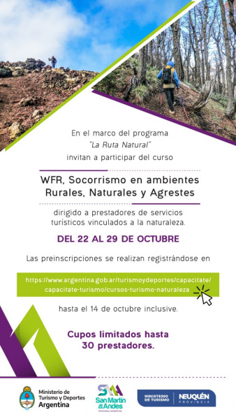 En el marco del programa “La Ruta Natural", invitan a participar del curso “WFR, Socorrismo en ambientes Rurales, Naturales y Agrestes” dirigido a prestadores de servicios turísticos vinculados a la naturaleza.