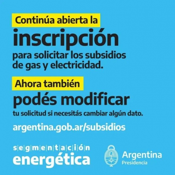 Se recuerda a los vecinos y vecinas de la ciudad que continúa abierto el formulario de inscripción a la “Segmentación Energética” que habilitó el Gobierno Nacional para solicitar subsidios al gas y la electricidad.