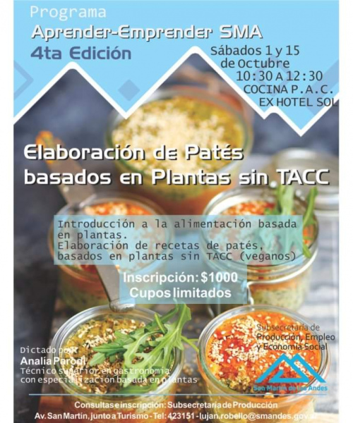 Se informa a la comunidad que se desarrollará una nueva edición del Programa Aprender-Emprender en San Martín de los Andes, que esta vez consistirá en un taller de elaboración de patés veganos sin TACC.