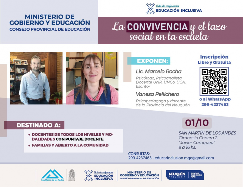 Dos nuevas jornadas del Ciclo organizado por el Ministerio de Gobierno y Educación, destinadas a docentes de todos los niveles y modalidades, personal de salud y comunidad, se llevarán a cabo en San Martín de Los Andes y Cutral Có.