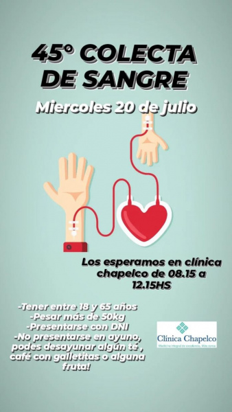Este miércoles 20 de julio se realizará la 45° Colecta de Sangre de San Martín de los Andes. Tendrá lugar en la Clínica Chapelco de 8.15 a 12.15 horas. En esta oportunidad, se podrá concurrir SIN TURNO.