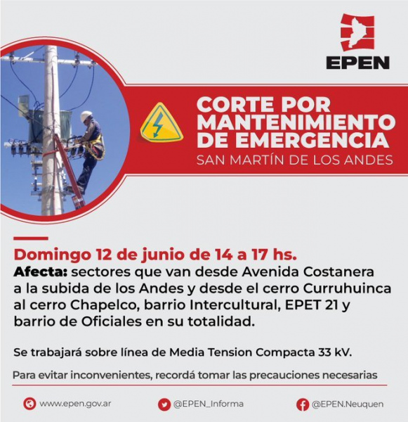 Será de 14.00 a 17.00 hs que abarcará la zona centro de Costanera a Cuesta de los Andes , Cerro Chapelco, Barrio Intercultural, EPET N°21 y Barrio de oficiales del Regimiento.