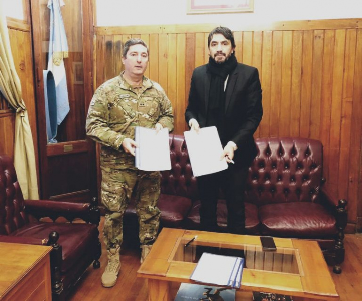 El intendente Carlos Saloniti y el teniente coronel Hernán Javier Chamadoira, Jefe del Regimiento de Caballería de Exploración de Montaña 4, firmaron dos convenios de cooperación interinstitucional.