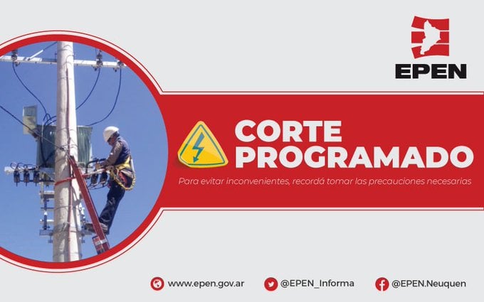 El Ente Provincial de Energía del Neuquén informa que debido a tareas de mantenimiento en transformadores, se realizarán dos cortes programados en la normal prestación del servicio eléctrico.