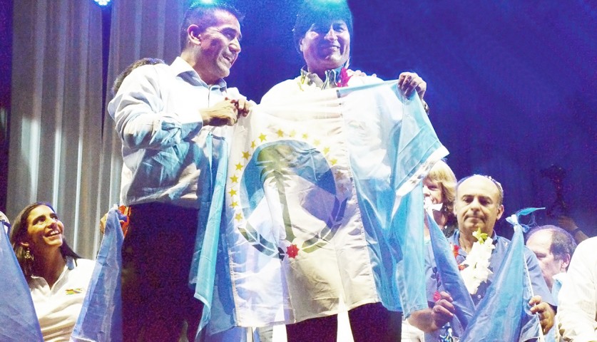 El candidato a gobernador por el FPV recibió el apoyo político del presidente de Bolivia, Evo Morales, que se entrevistó con el neuquino tras el acto al que fue especialmente invitado, en Santa Cruz de la Sierra.